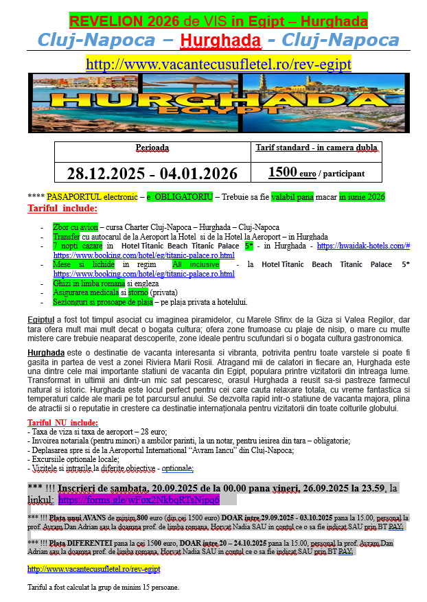 - Zbor cu avion – cursa Charter Cluj-Napoca – Hurghada – Cluj-Napoca
